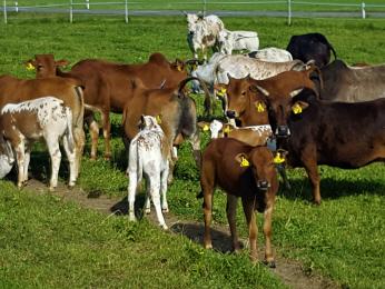 Auf unseren großen Weiden haben ca. 30 Zwerg-Zebus genügend Auslauf und können sich das ganze Jahr über draußen frei bewegen und frisches grünes Gras fressen. Sie leben in einer überschaubaren Herde in engem Kontakt mit uns Menschen.