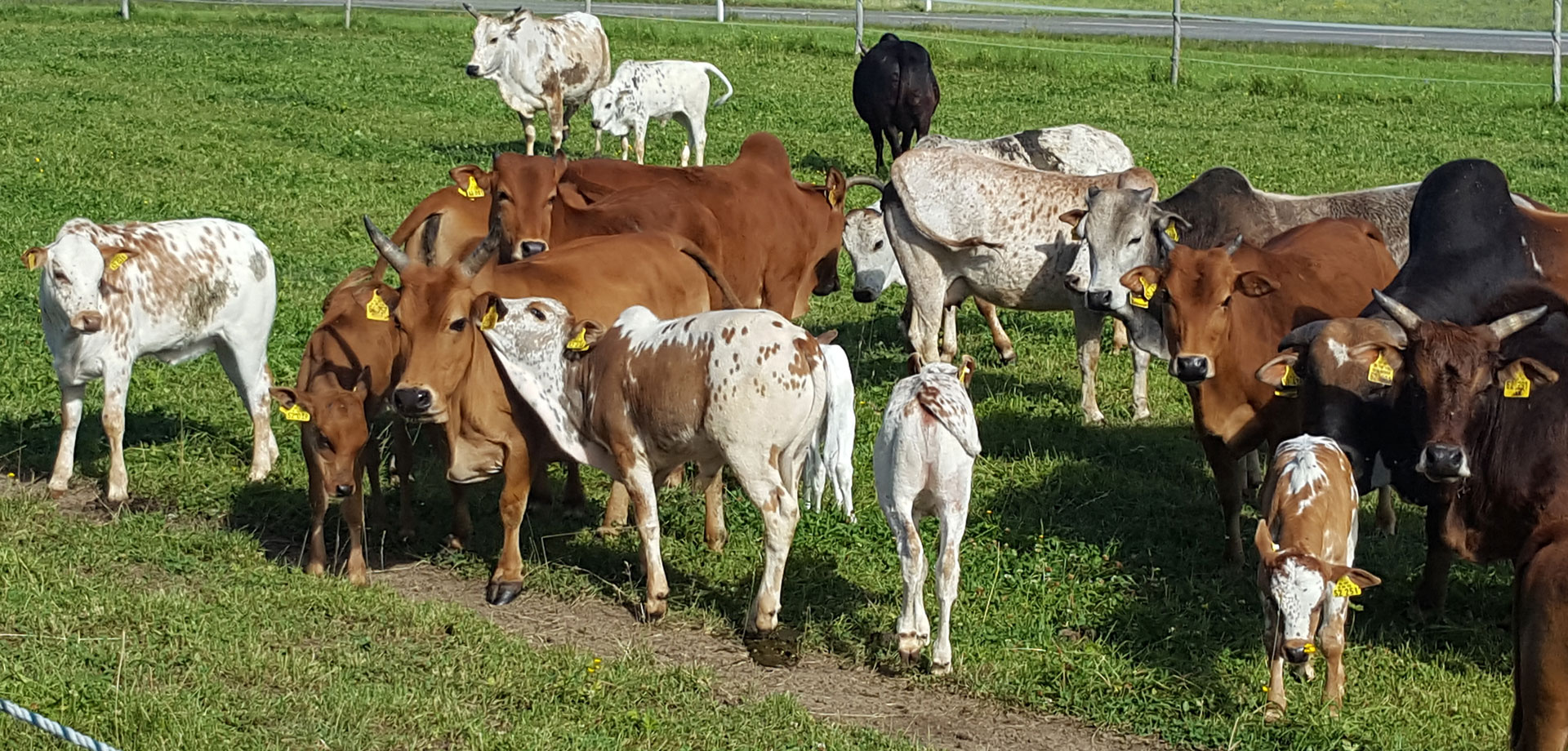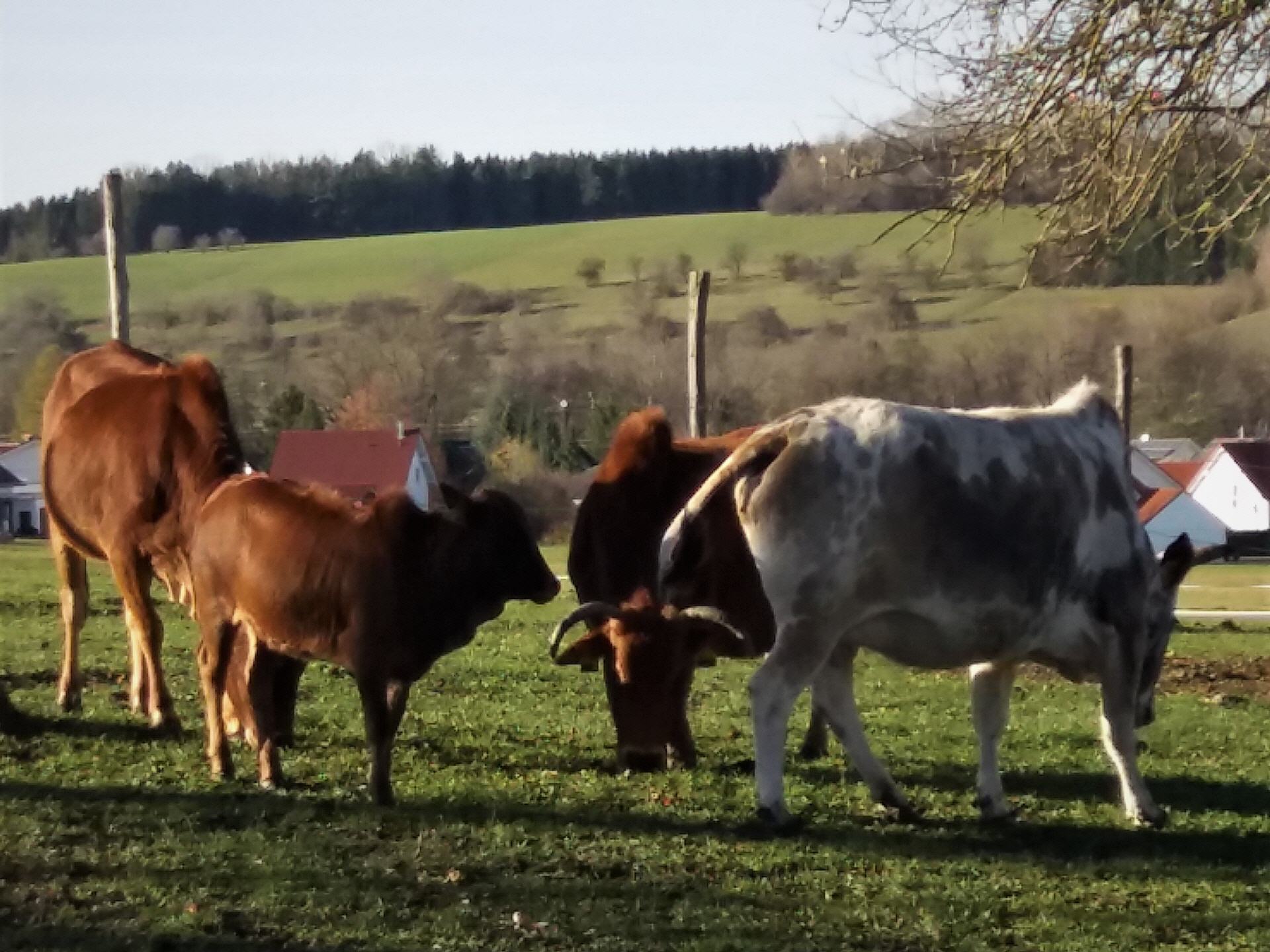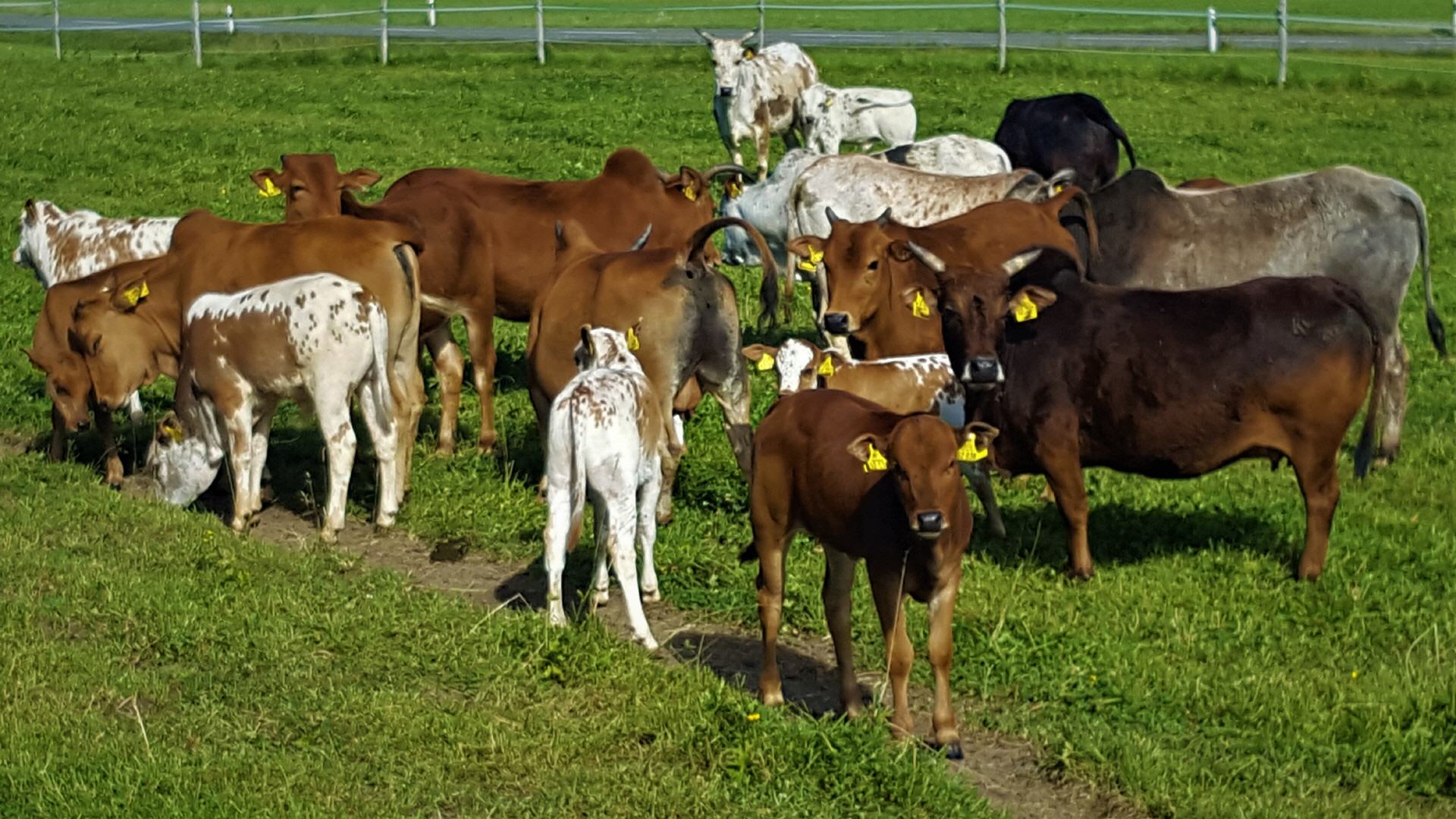 Auf unseren großen Weiden haben ca. 30 Zwerg-Zebus genügend Auslauf und können sich das ganze Jahr über draußen frei bewegen und frisches grünes Gras fressen. Sie leben in einer überschaubaren Herde in engem Kontakt mit uns Menschen.